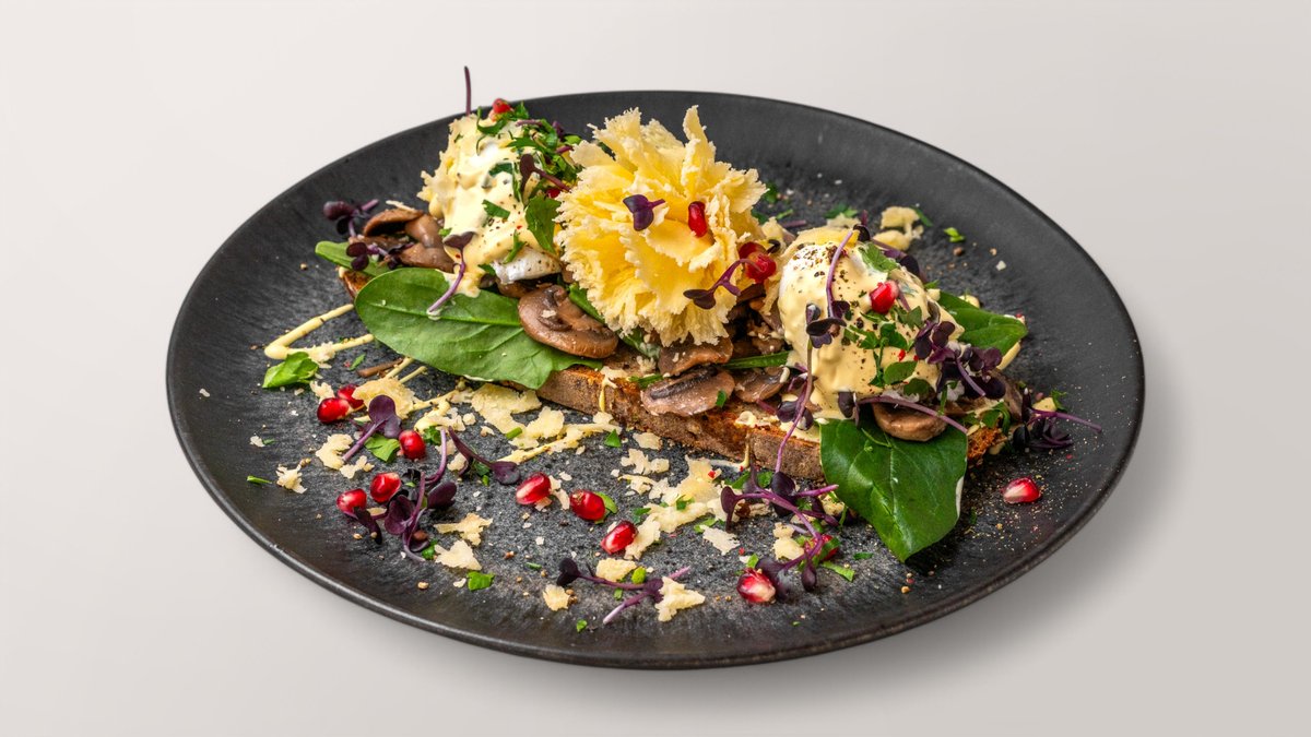 frisches Dinkelbrot,2 pochierte Eier, Champignons, Spinat, Petersilie, Hollandaise Sauce und Tate de Moine Käse