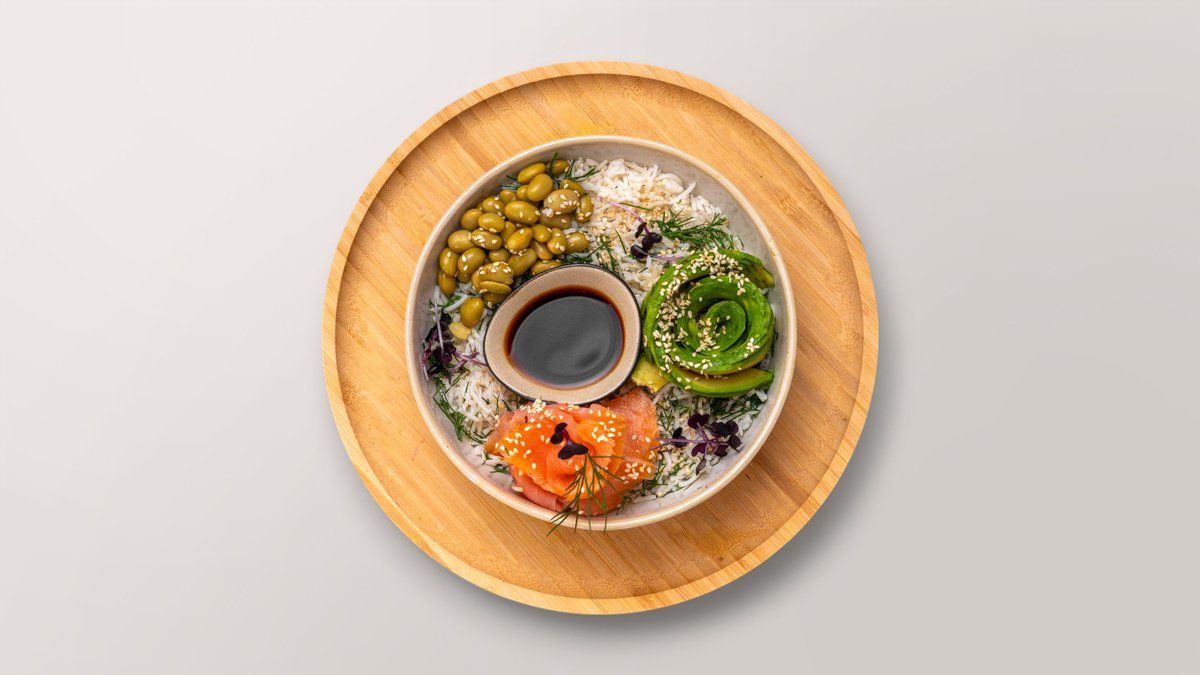 mit Reis, Lachs, Avocado, Edamame, Sesam, Sojasauce und Dill