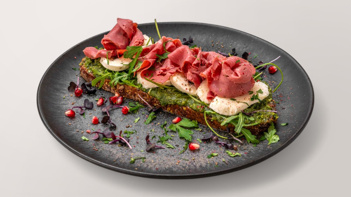 frisches Dinkelbrot, hausgemachtes Pesto, Pastrami, Mozzarella, Rucola, Petersilie