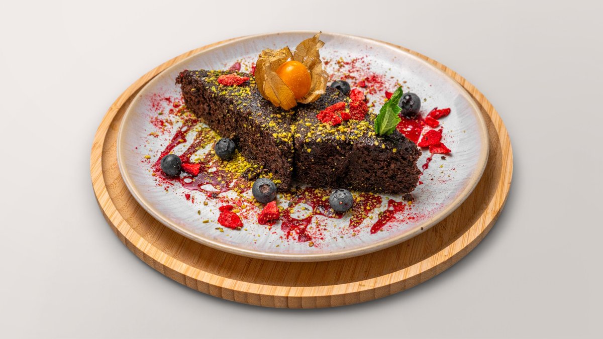 Teig bestehend aus: Datteln,Banane, Mandelmehl, Mandel Milch, Kakaopulver, Pistazien. Topping und hausgemachte Schattenmorellen Marmelade ✅Kein Weizenmehl- Kein Zucker, Gluten-free