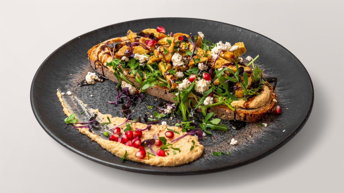 frisches Dinkelbrot, Hummus, Rucola, Champignon, Feta Käse Vegan, Granatapfel, Röstzwiebeln, Petersilie