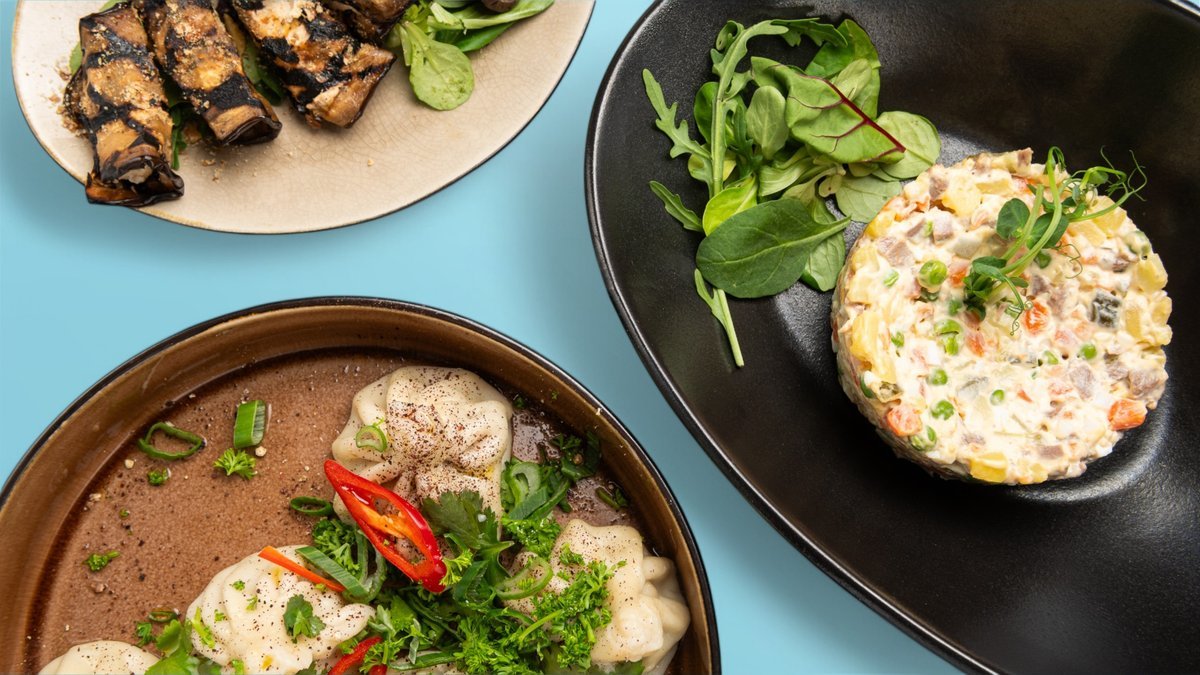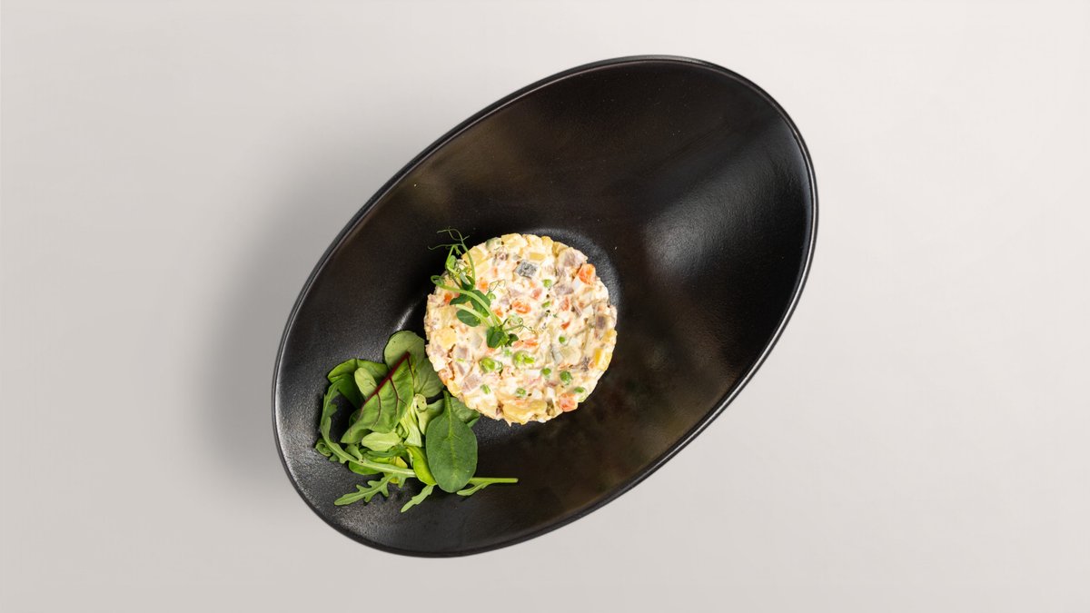 mit Kalbszunge, Kartoffel, Mayonnaise, Eiern, Möhren und Erbsen