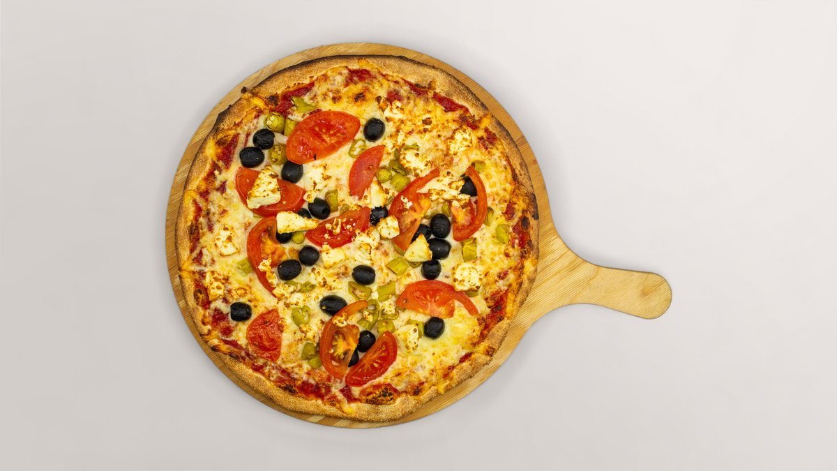 mit frischen Tomaten, Hirtenkäse, Peperoni und Oliven