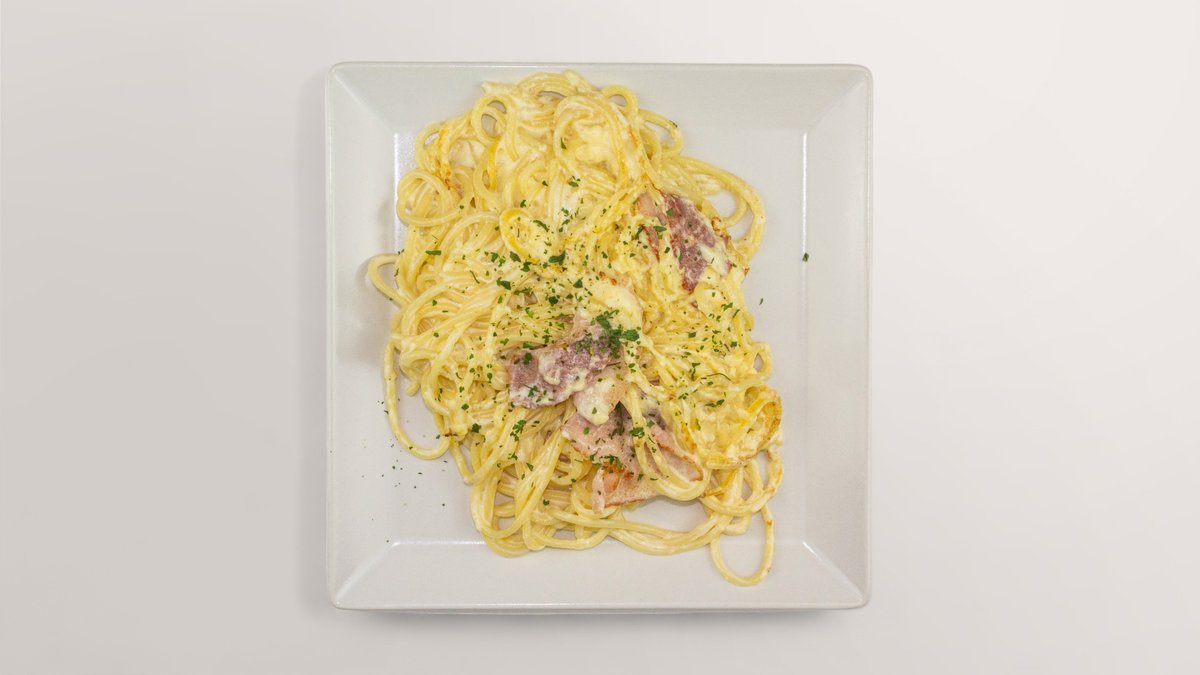 mit Speck vom Schweinefleisch, Ei und Sahnesoße