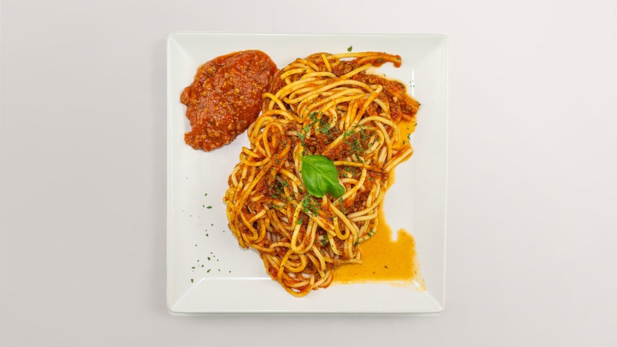 mit Nudelröllchen, Bolognesesoße vom Rind, Knoblauch, Kräuter, Tomaten-Sahnesoße und Käse