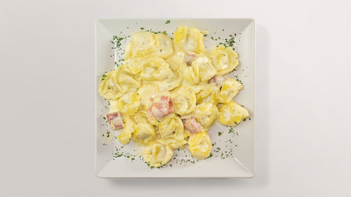 mit Canneloni, Tortellini, Maccaroni, Erbsen, Formfleisch-Vorderschinken vom Schweinefleisch, frischen Champignons, Salami vom Rindfleisch , Tomatensoße und Käse