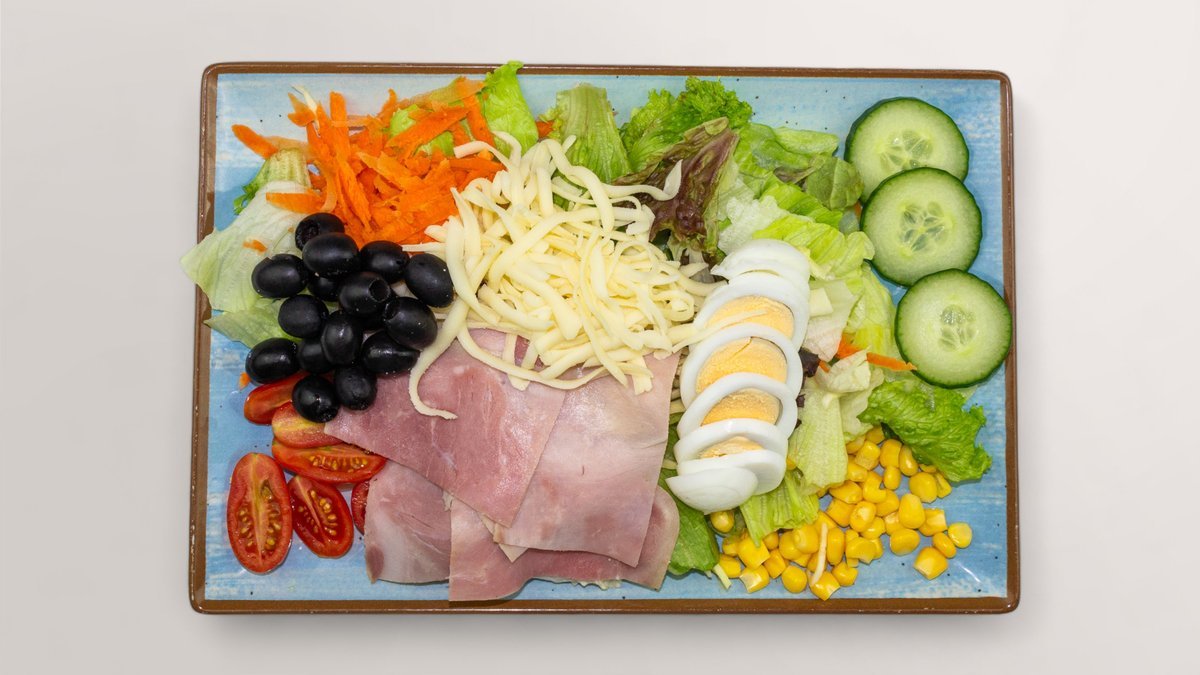 mit Eisbergsalat, Weißkohl, Gurken, Kirschtomaten, Mais und Möhren