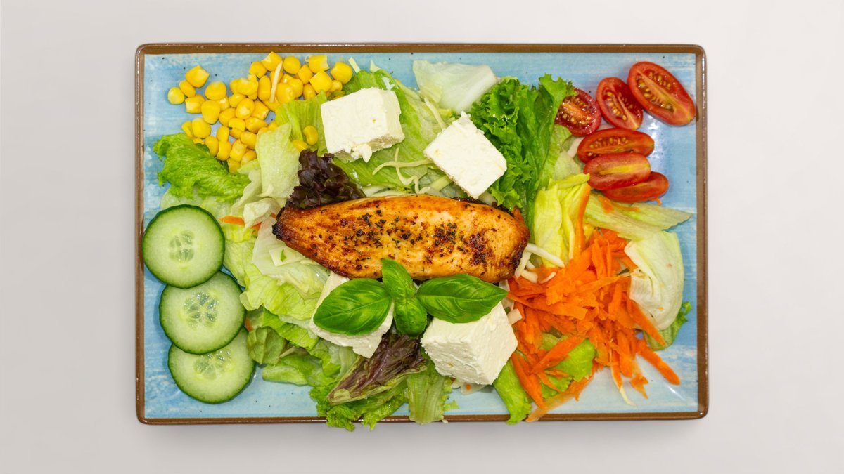 mit 120 g gegrilltem Lachs und Hirtenkäse