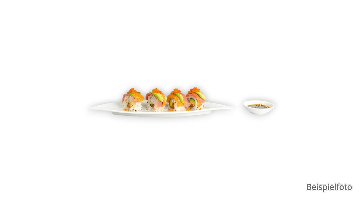 mit flambiertem Lachs, Garnelen, Avocado, Gurken, Limette, Tobiko, Tsatsiki und Unagi-Soße Enthält Alkohol, für Kinder und schwangere Frauen nicht geeignet