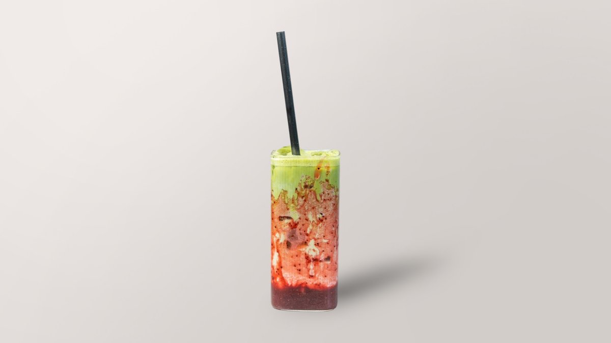 gekühlter Matcha Latte mit Eiswürfeln – wahlweise mit Püree