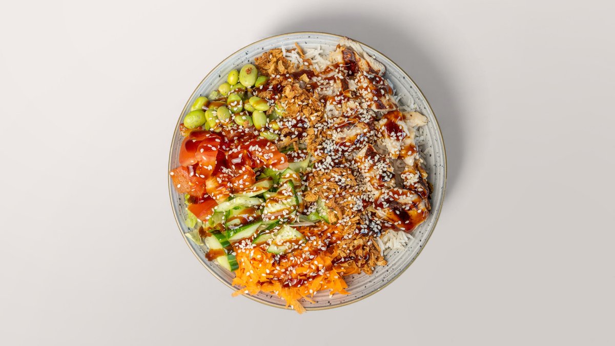 mit Salat, Chicken, Tomaten, Gurken, Karotten, Edamame, Röstzwiebeln, Erdnüsse