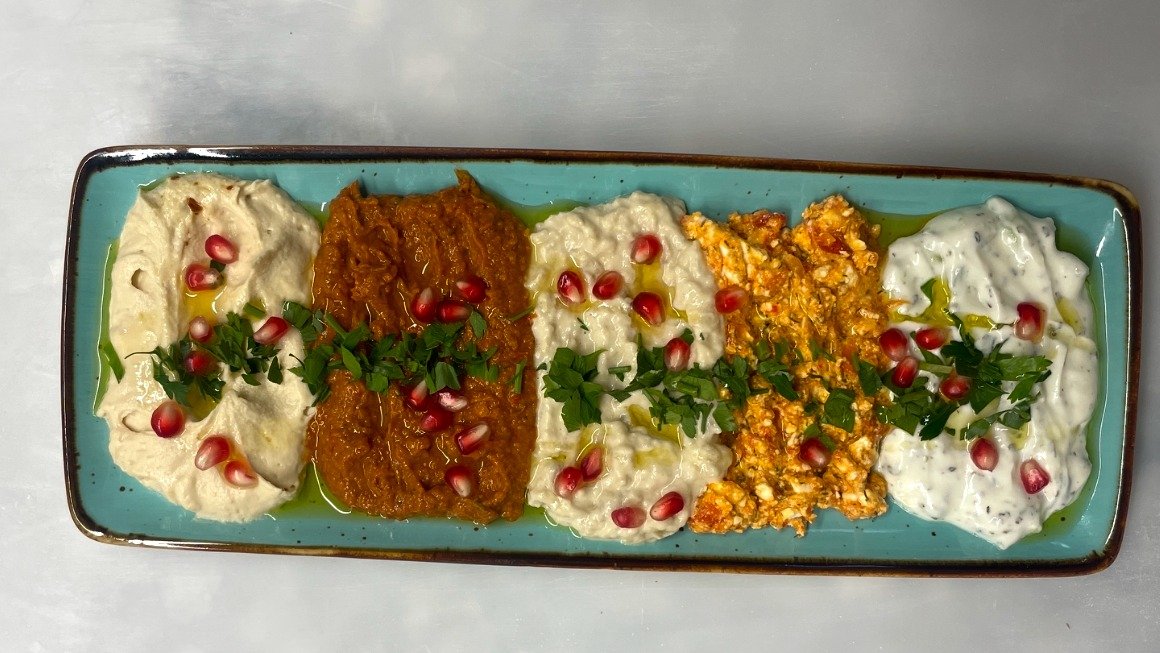 Teigfladen mit schafskäse-Creme, Baba Ghanoush, Cacik, Hummus, Muhamara, Petersilie, Granatapfel und Olivenöl