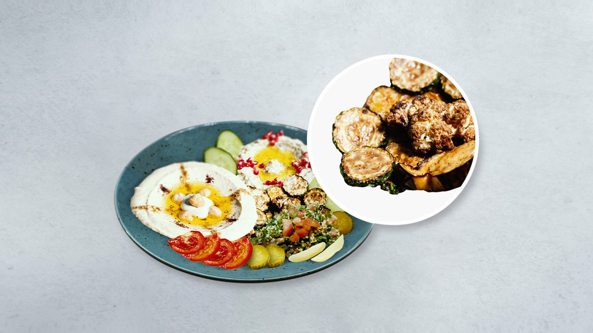 leicht scharf gegrilltes mariniertes Puten- und Rindfleisch, Falafel, gebratene Auberginen, Hummus, Mutabal, leicht scharfe Paprikasoße und Salat