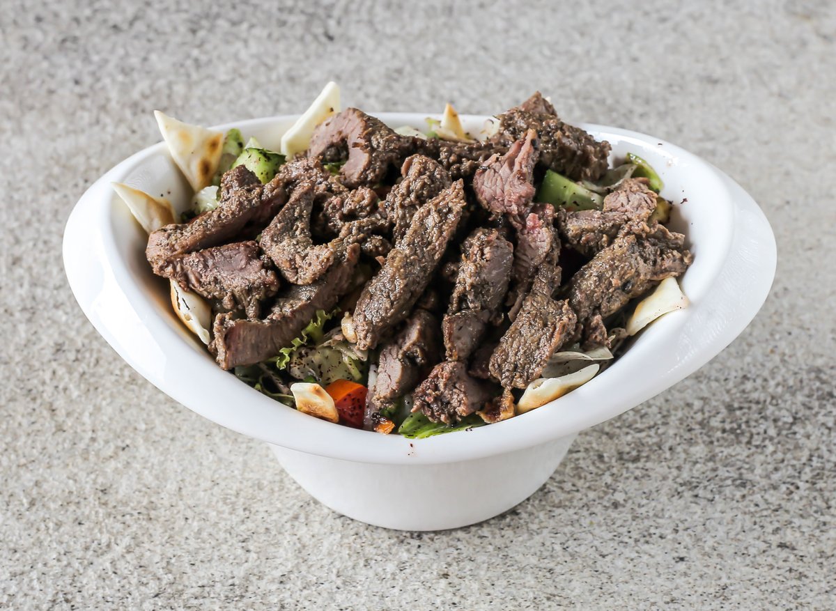 mittelscharf mit Falafel, gebratenen Auberginen, Hummus, Mutabal, Paprikasoße, Salat, gegrilltem Putenfleisch und Rindfleisch