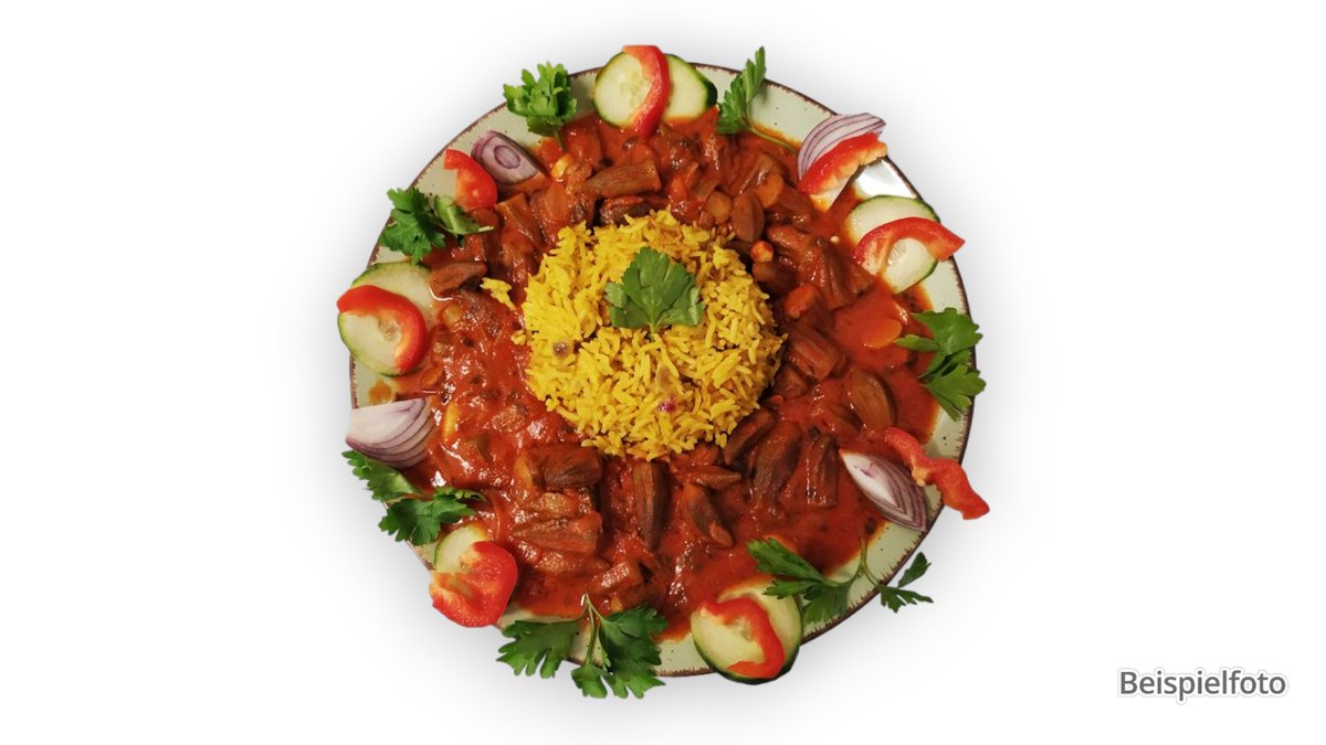 Okraschoten in Tomatensoße, frischer Koriander, orientalischer Reis und Rindfleisch