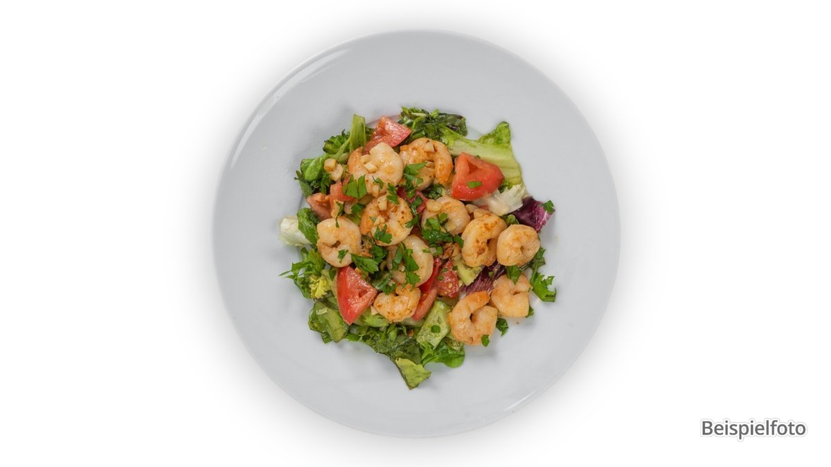 gegrillte Garnelen mit saisonalem Salat, serviert mit hausgemachter, würziger Fischsoẞe