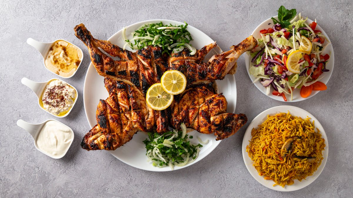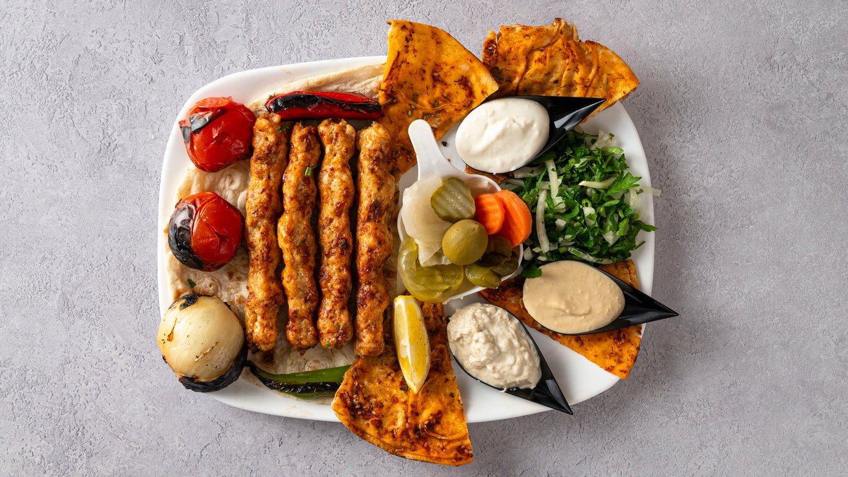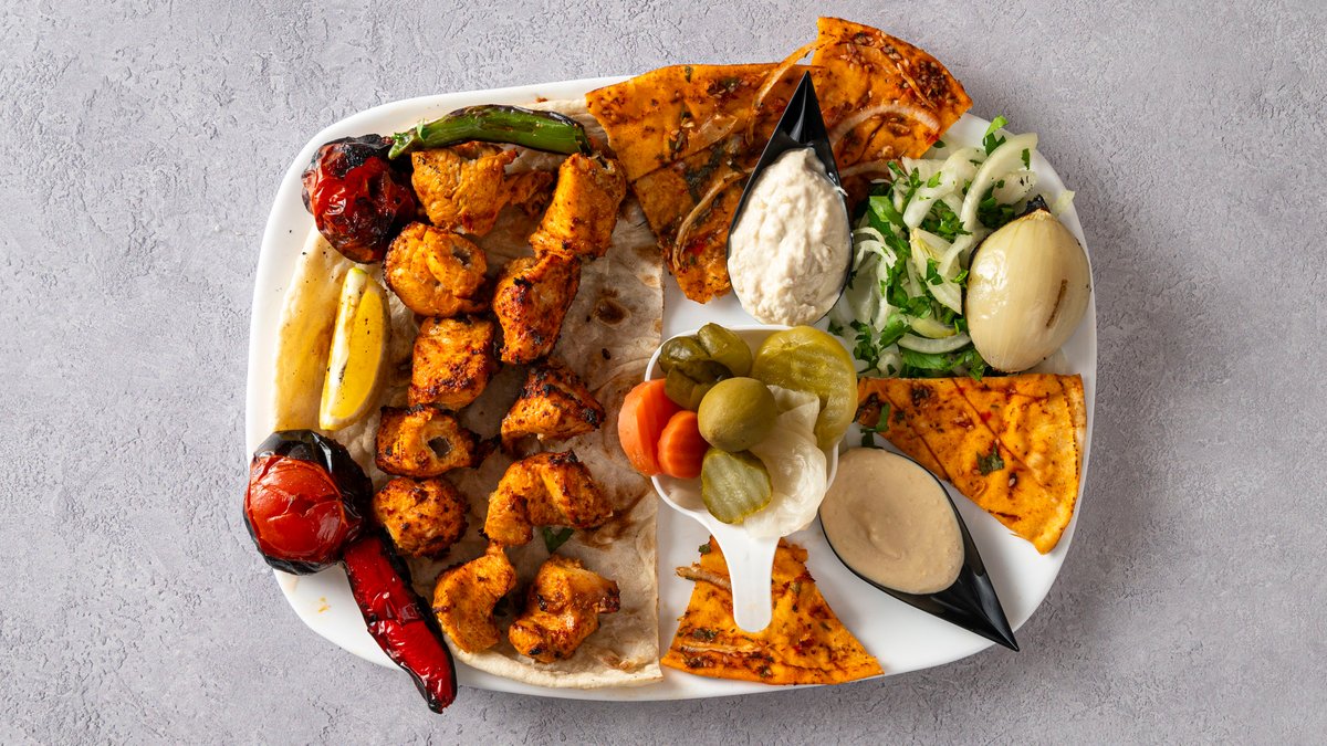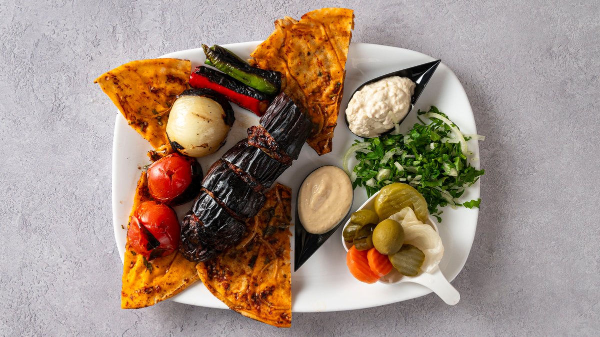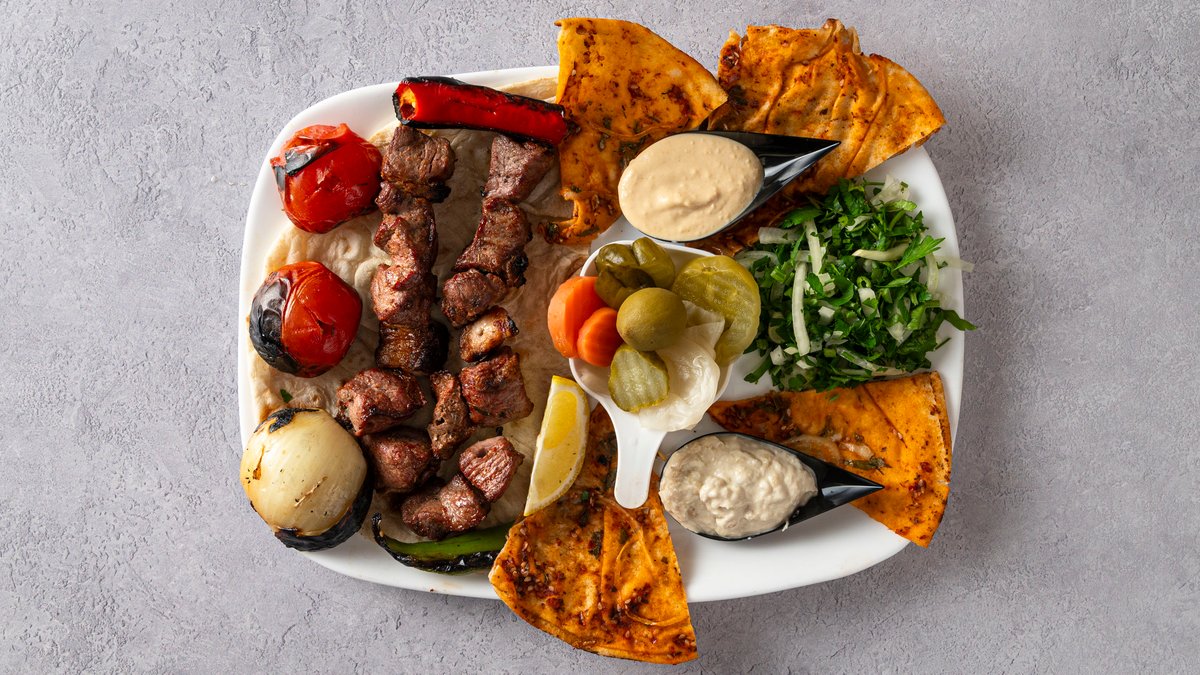 alle Platten werden mit Salat, Hummus, Mutabal, arabischem Fladenbrot, Muhammara, Tomaten, Zwiebeln und Paprika serviert