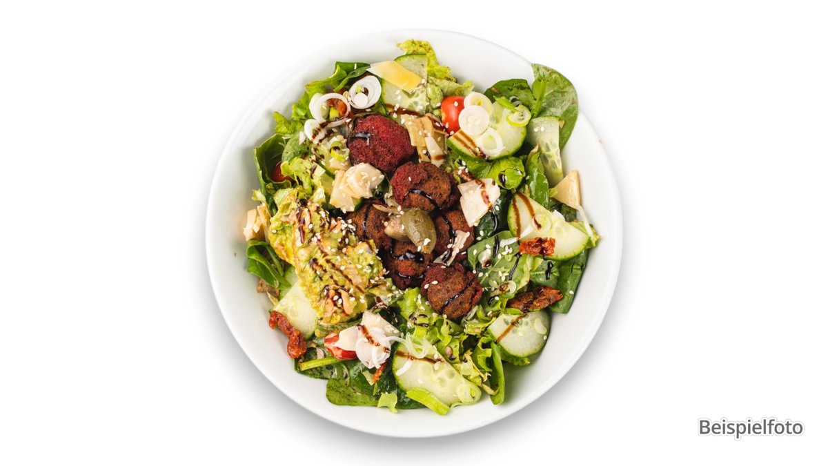 alle Salate werden mit Dressing nach Wahl und 5 Pizzabrötchen serviert