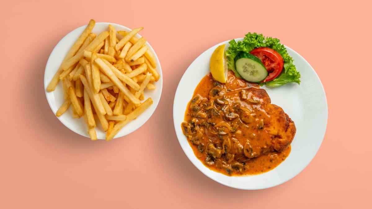 goldbraun panierte Schnitzel aus der Hähnchenbrust, mit scharfer Champignonsoße und Pommes frites