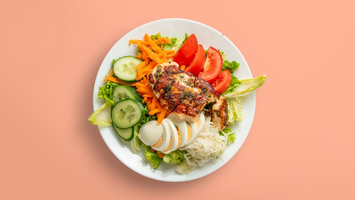 mit Blattsalaten, Tomaten, Mais, Gurken, Ei und frisch gegrilltem Hähnchenbrustfilet