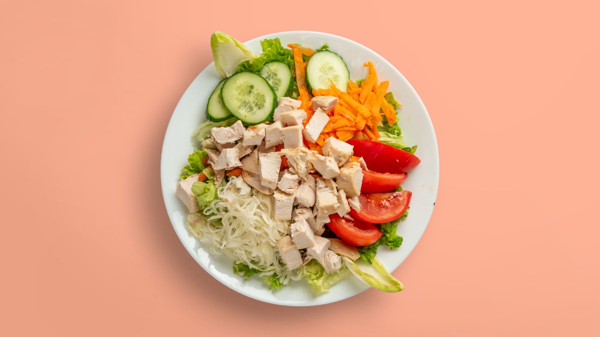 mit Blattsalaten, Tomaten, Mais, Gurken, Kraut, Karotten und Hähnchen