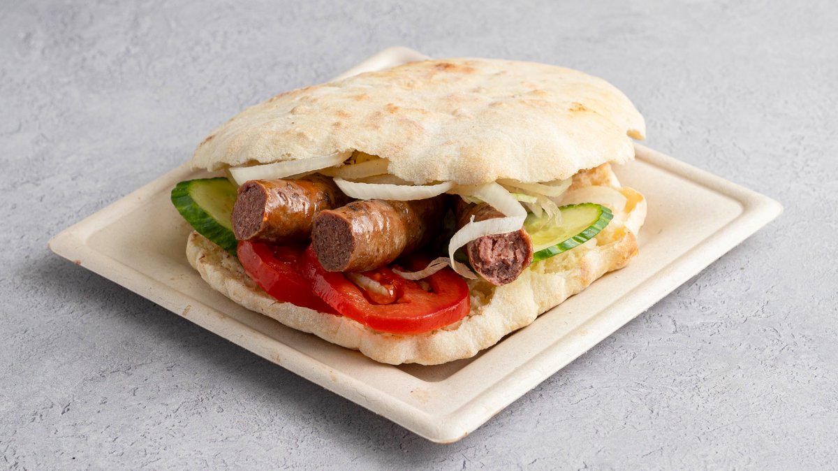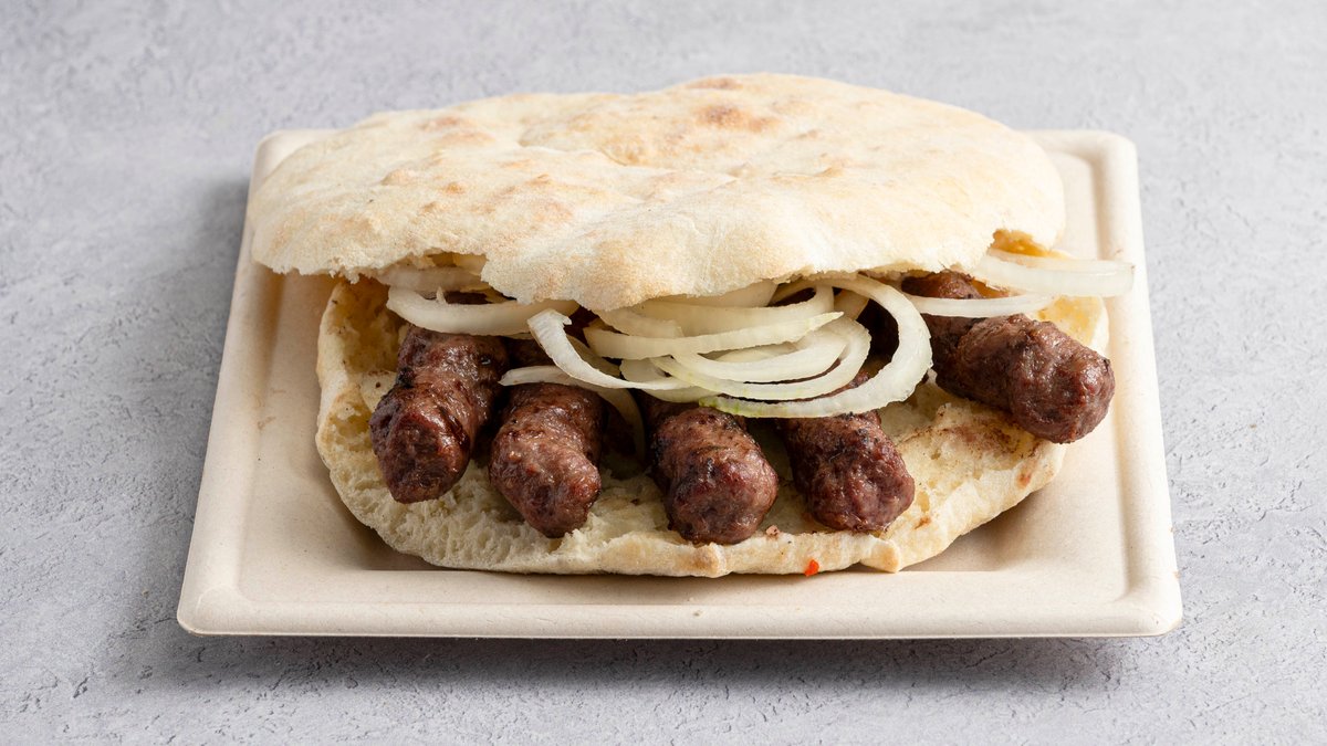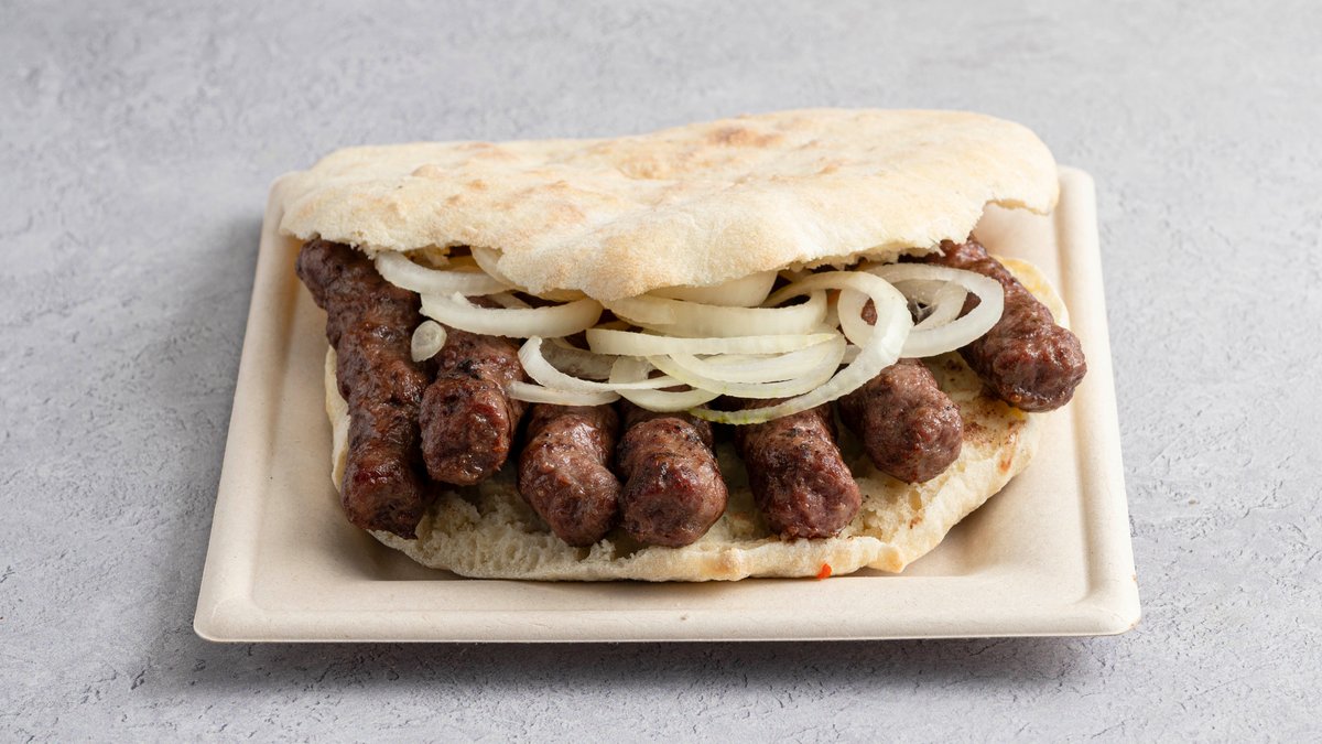 5x Cevapi vom Rind 1x Standard-Burger vom Rind, kleine Pommes frites und hausgemachtes Fladenbrot