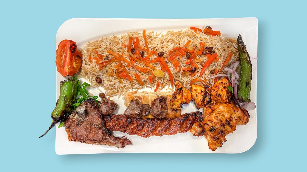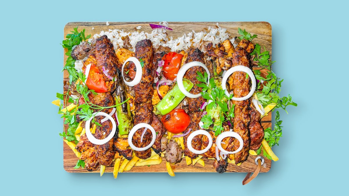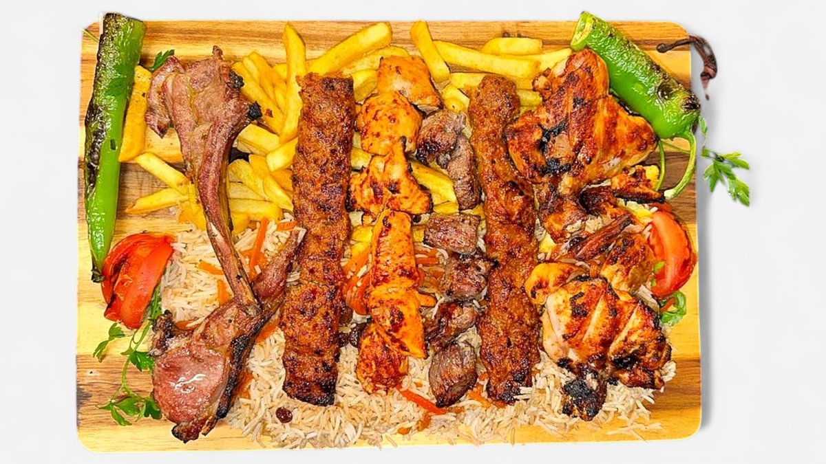 5x verschiedene Fleischsorten (Lammkoteletts, Hähnchenunterkeule, Lammspieß, Hähnchenspieß, Adana-Spieß vom Lamm) gegrillt mit Pommes frites und Qabuli