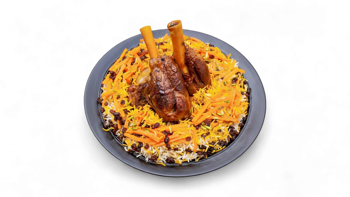 Lammunterkeule mit braungebackenem Basmatireis, Rosinen, Karottenstreifen, Mandeln und Pistazien