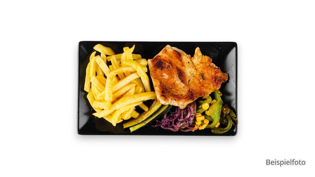 1x Truthahn-Spießbraten-Teller 1x Pommes frites 1x gemischter Salat
