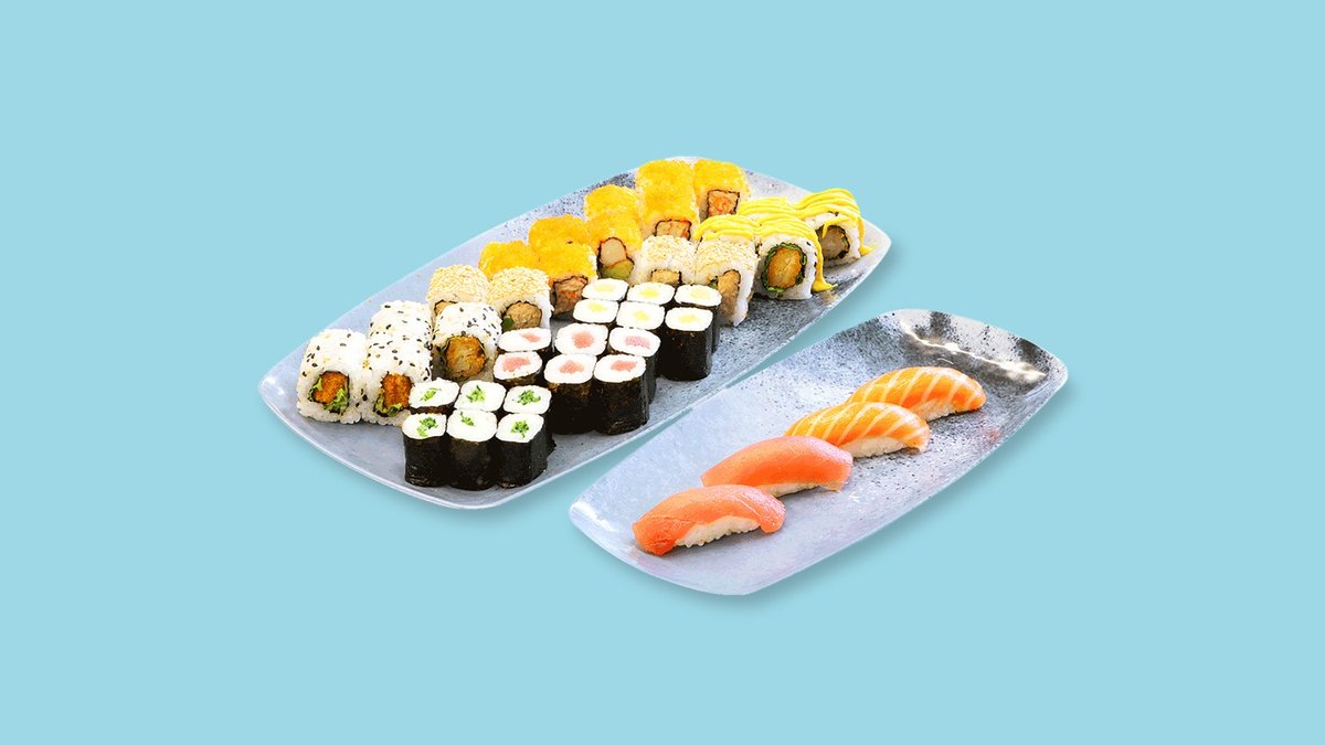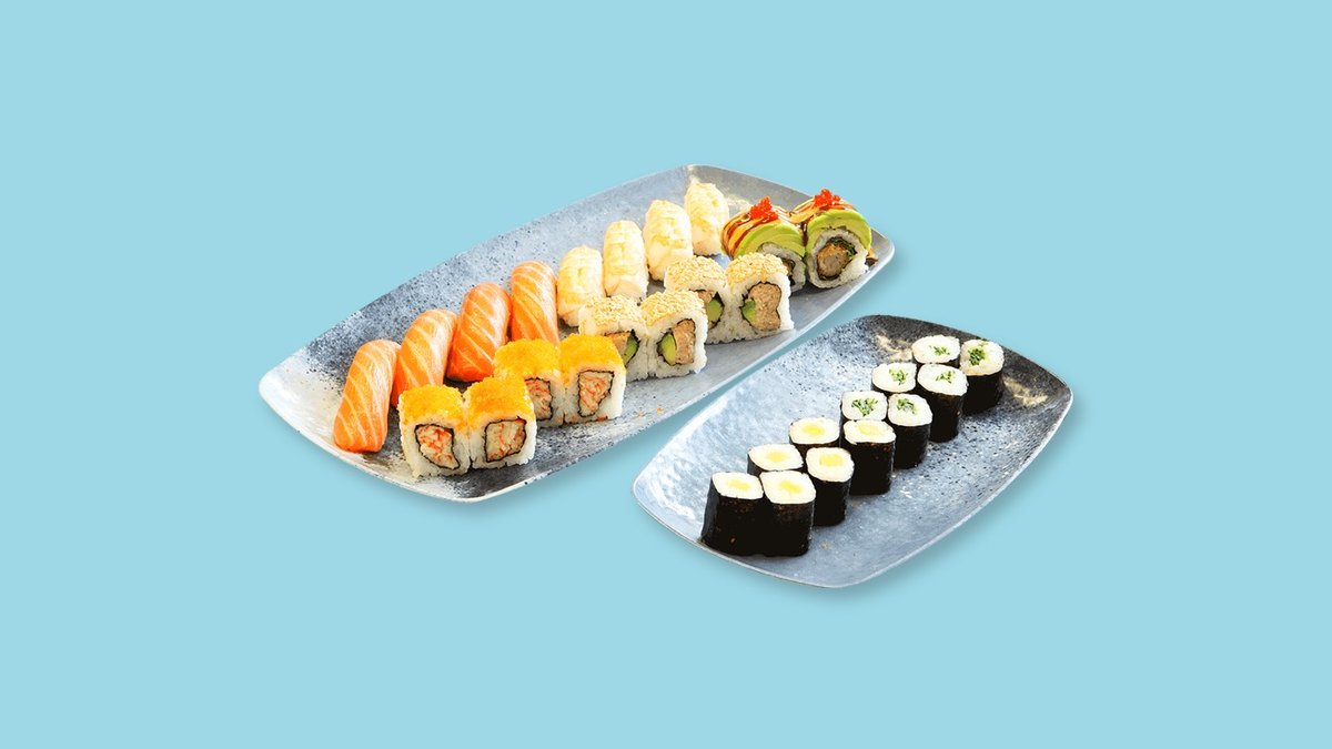 42 Stück 6x Oshinko Maki 6x Tekka Maki 6x Kappa Maki 2x Shake Nigiri 2x Maguro Nigiri 4x California Roll 4x Chicken Mango Roll 4x Ebi Tempura Roll 4x Canadian Roll 4x Tuna Roll