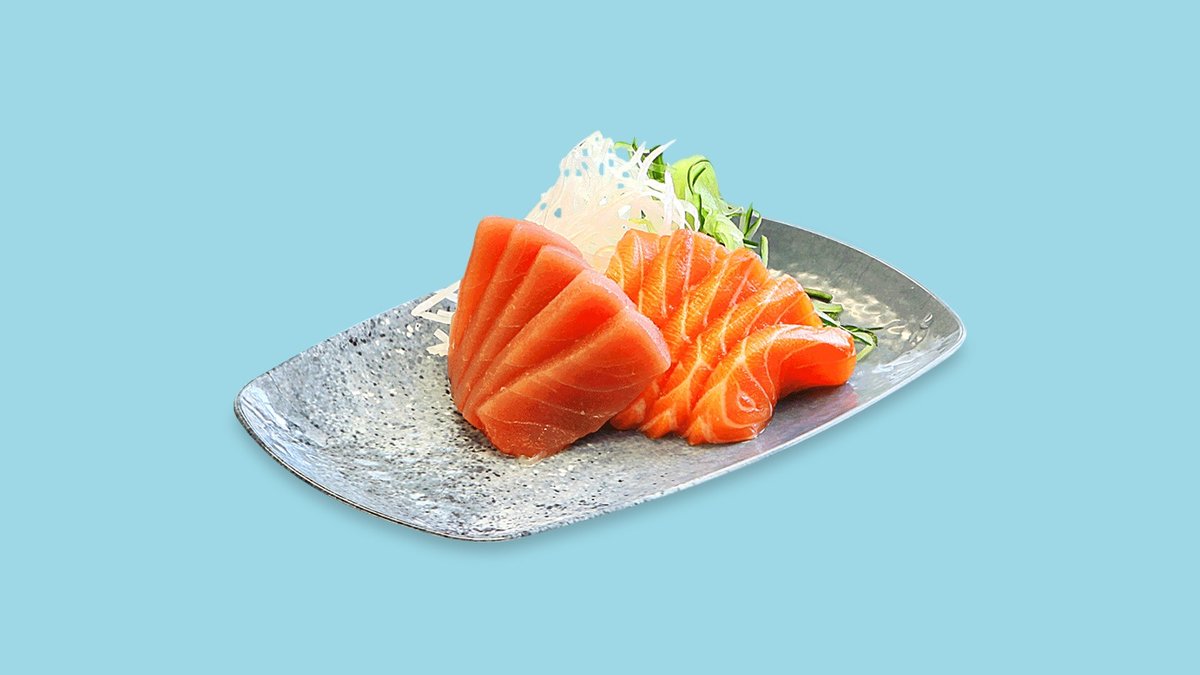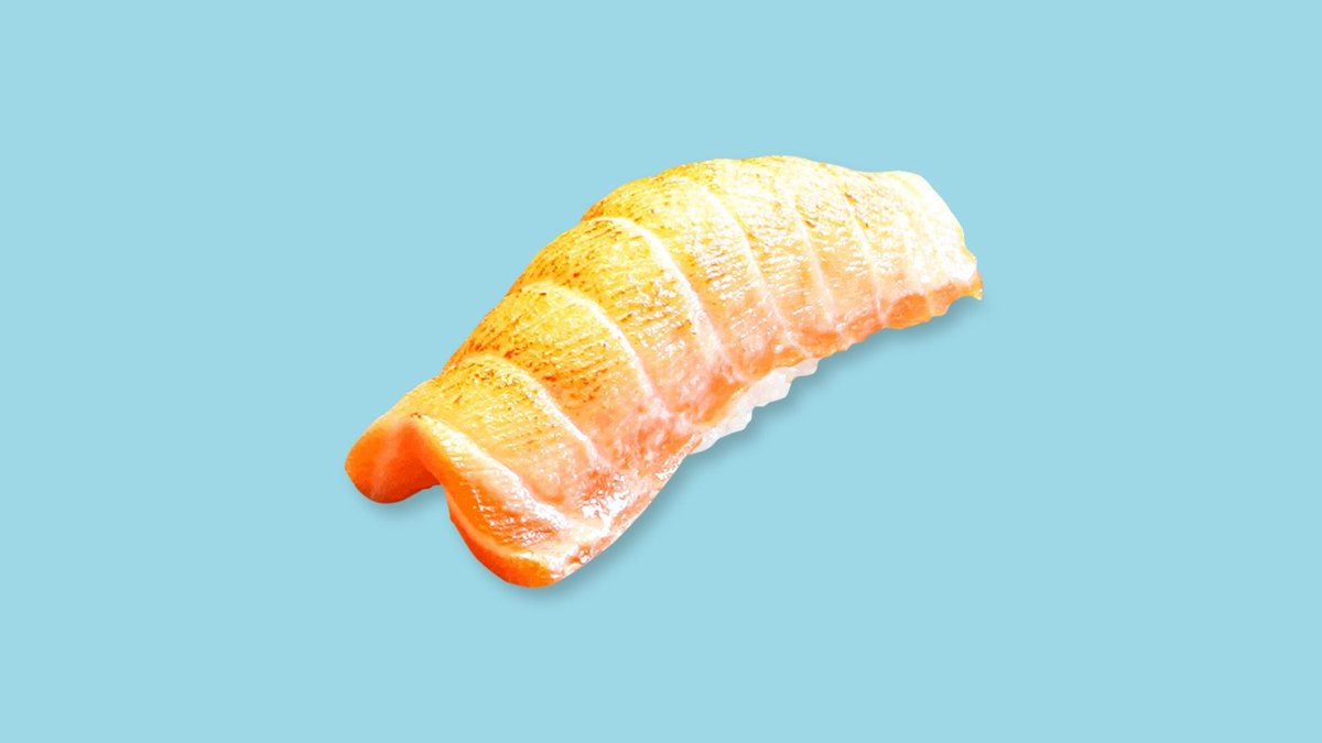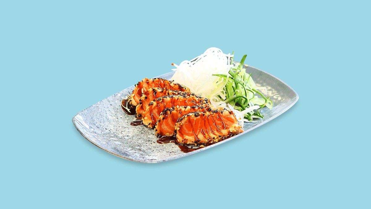 mit flambiertem Lachs, Lachs Sashimi, Avocado und Tobiko