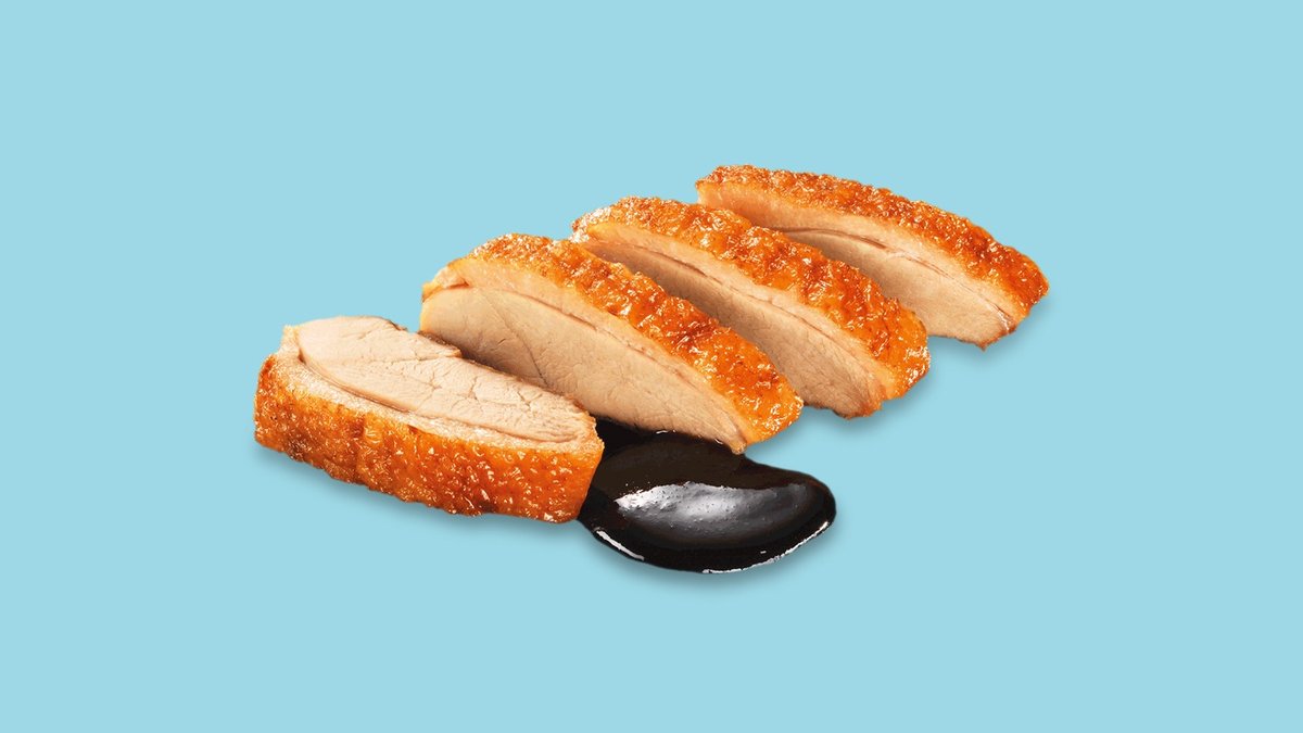 mit Ente, Mango, Fischrogen, Sesam und pinkanter Soße