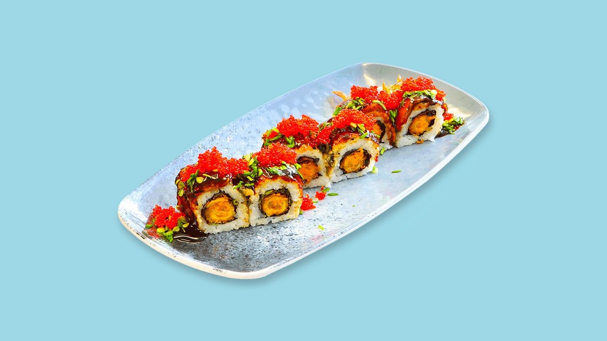 mit flambiertem Seeaal, Tempura-Garnelen und Tobiko