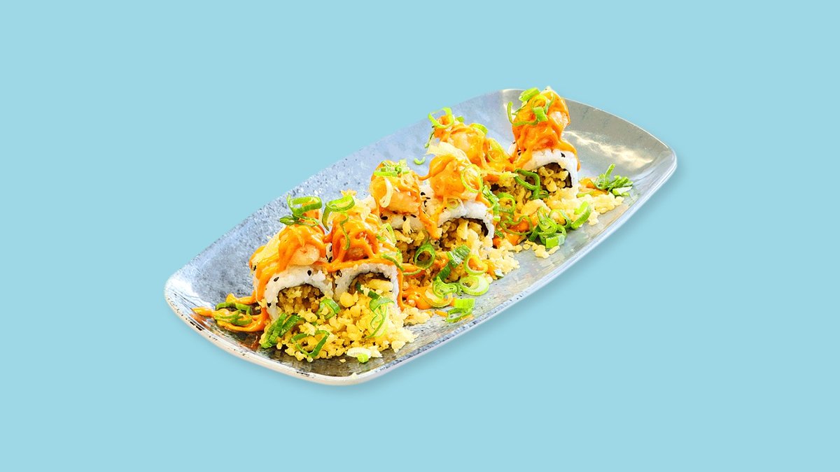 mit Tempura-Garnelen, scharfer Mayonnaise und Tempuraflocken