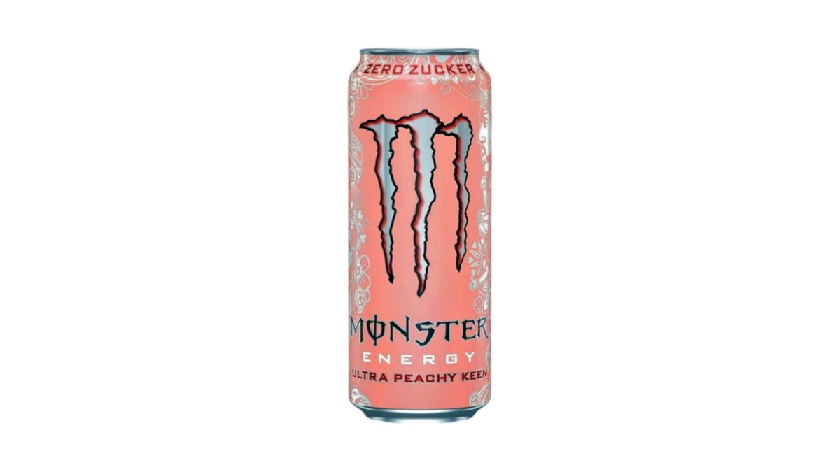 Energy-Drink: Koffeinhaltiges Erfrischungsgetränk mit Pfirsich-Geschmack, Taurin, L-Carnitin, B-Vitaminen, mit Süßungsmitteln.
