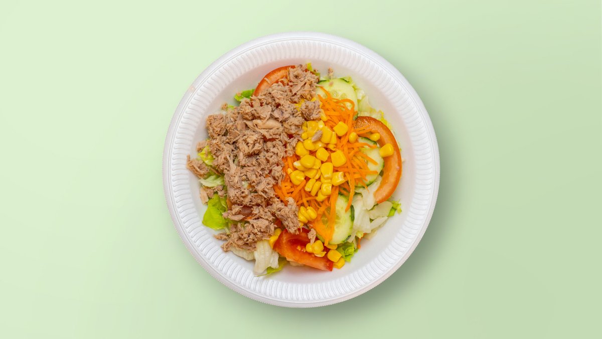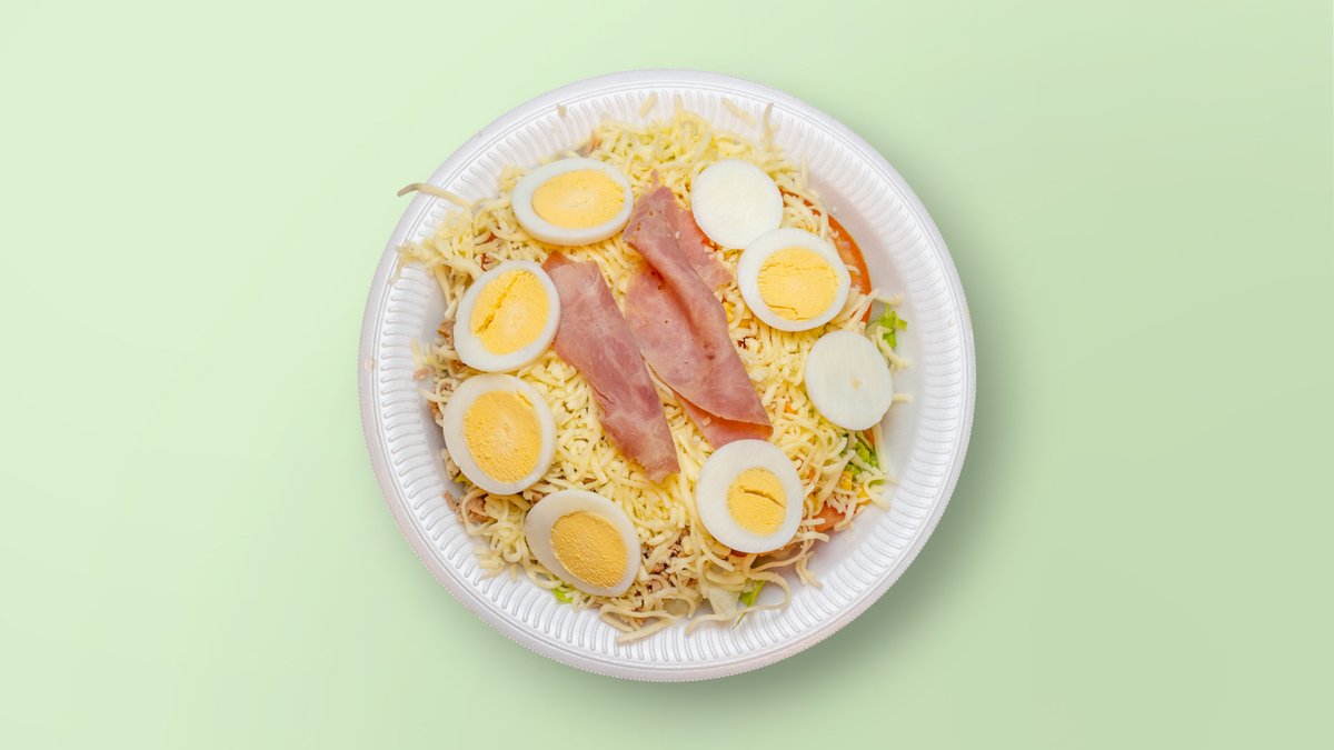 grüner Salat, Tomaten, Gurken, Thunßisch, Formfleisch-Truthahnschinken, Käse, Mais, Ei und rote Bohnen