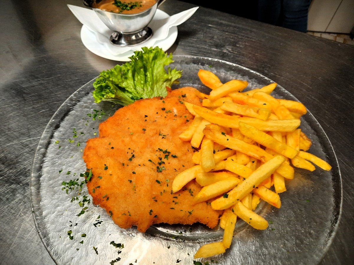 Schweineschnitzel natur in Weißweinsoße mit Pommes frites und Salat Enthält Alkohol, für Kinder und schwangere Frauen nicht geeignet