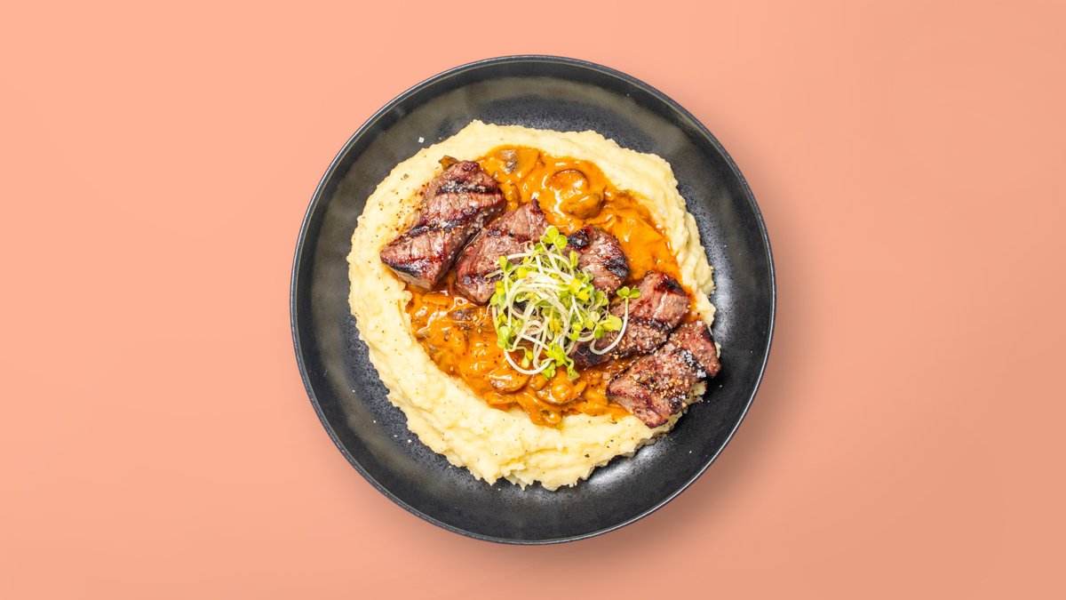 Ragout aus Rumpsteakspitzen mit Champignons in klassischer Soße (Sauerrahm, Senf, Weißwein, Salzgurken, Zwiebeln und Zitronensaft) und einer Beilage deiner Wahl Enthält Alkohol, für Kinder und schwangere Frauen nicht geeignet