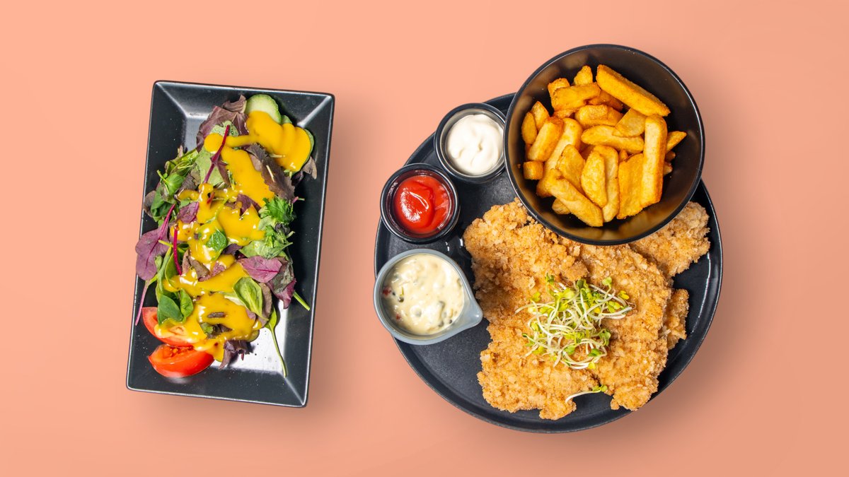 alle Schnitzel werden mit einer Fleischsorte, einer Beilage und einem Dressing deiner Wahl zubereitet