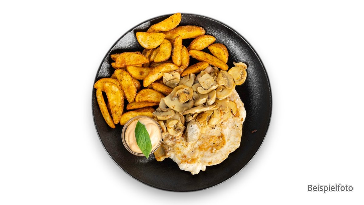 paniertes Schnitzel mit Champignon-Rahmsoße und Pommes frites