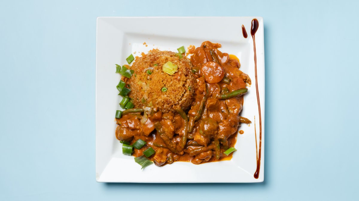 Couscous mit Erdnuss-Creme-Soße und Gemüse. Wahlweise mit Hähnchen oder Lammfleisch