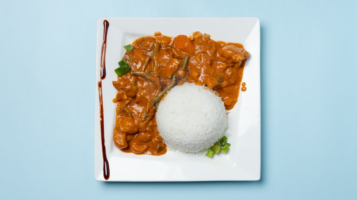 asiatisches Curry mit verschiedenen Gemüsesorten, Chinakohl, Kokosmilch und Duftreis. Wahlweise mit Rind, Hähnchen oder Tofu