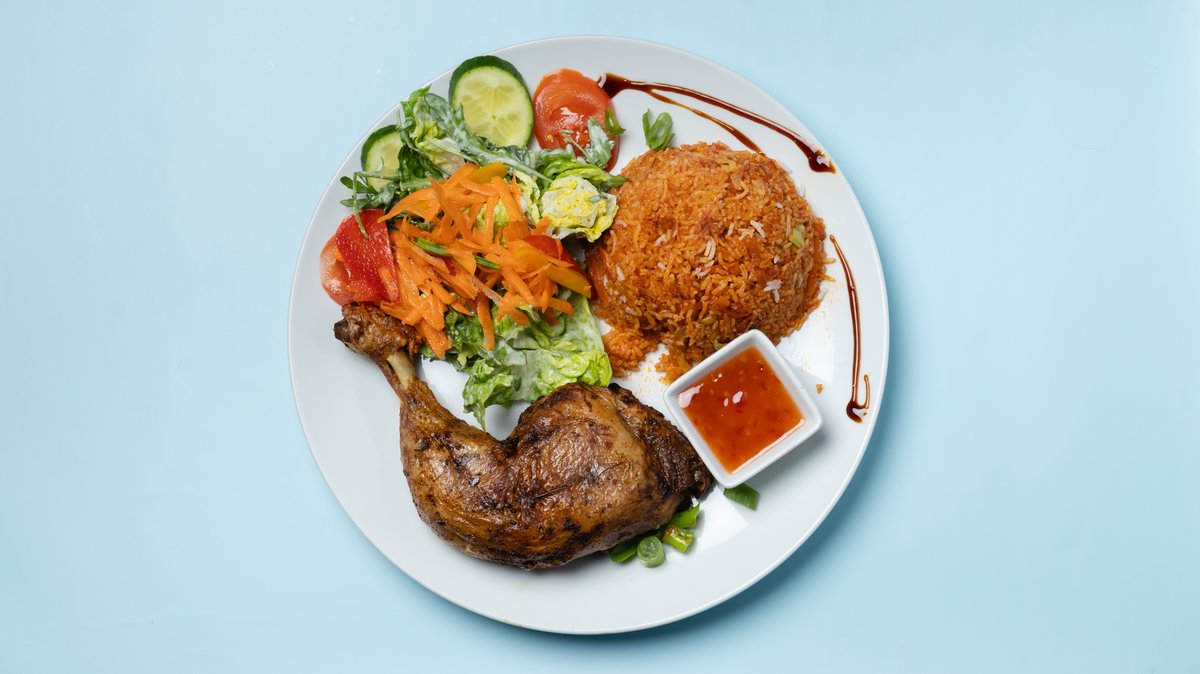 Reisgericht mit gegrilltem Hähnchenfleisch und Salat-Bouquet