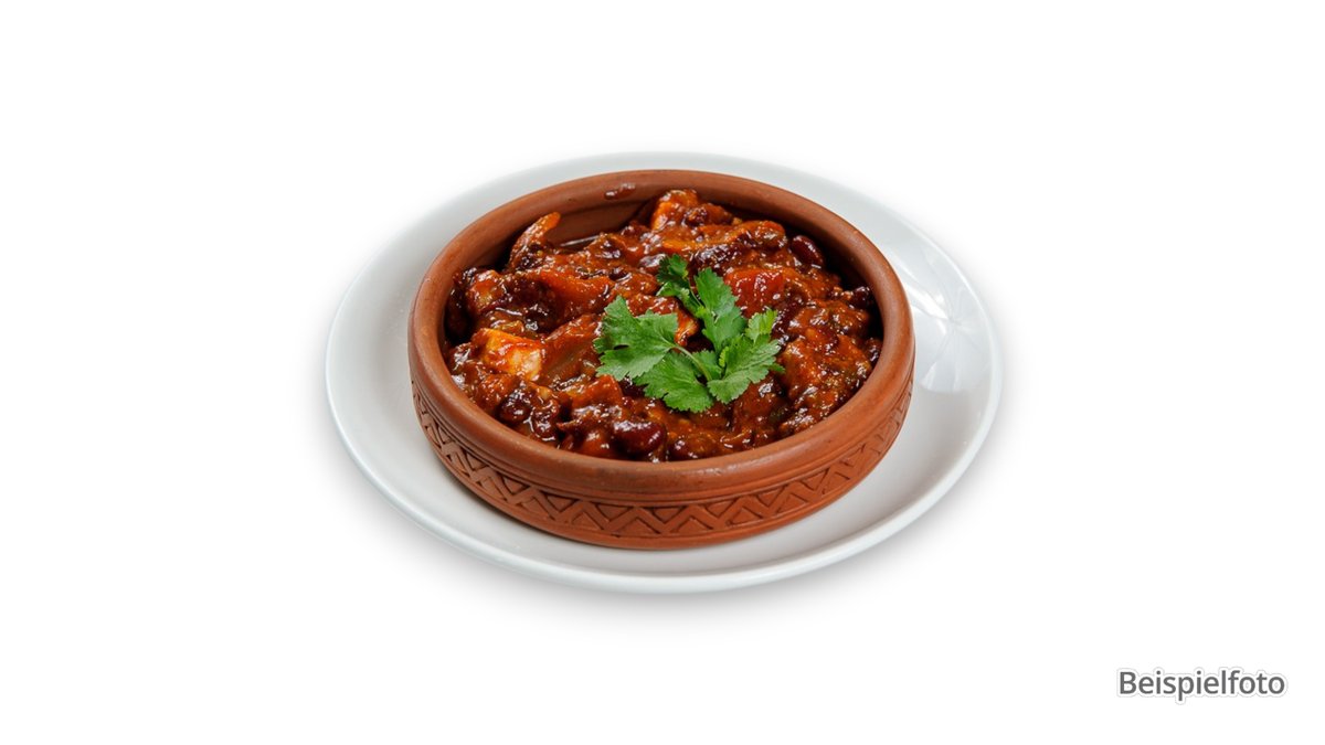 Gemüsegericht mit einer Mischung aus Auberginen, Paprika, Tomaten, Zwiebeln, Knoblauch und gewürzt mit Kräutern wie Koriander und Basilikum, dazu Brot