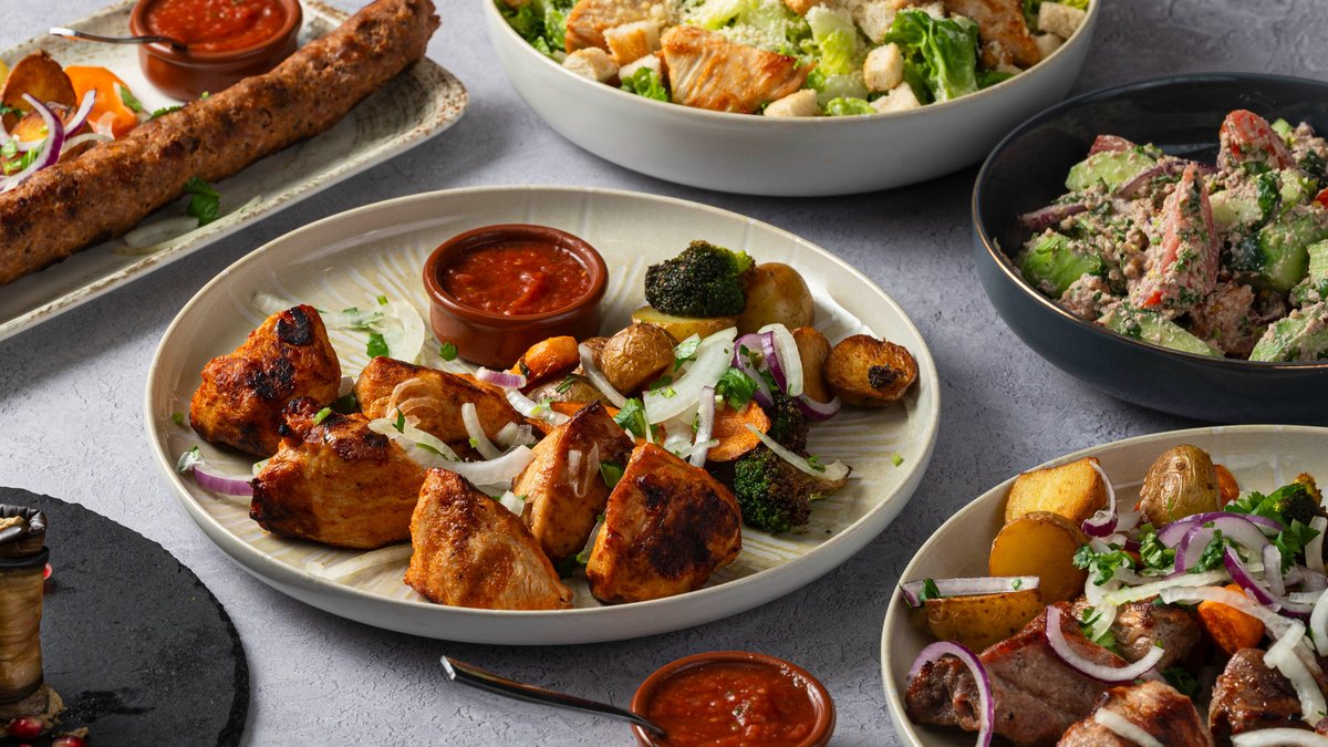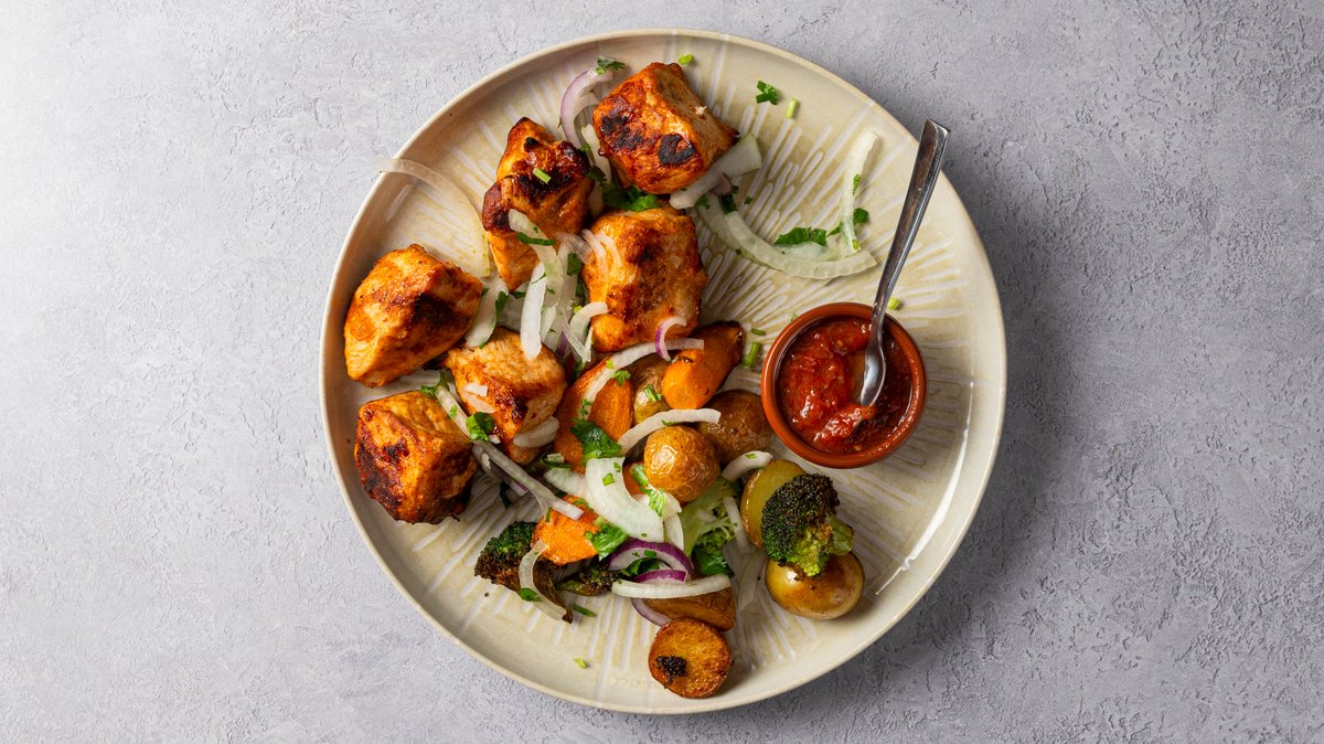 2 Stück gegrillte Hähnchenspieße mit Garnitur