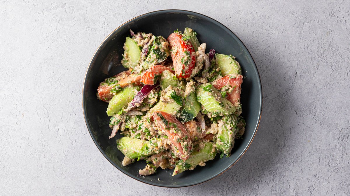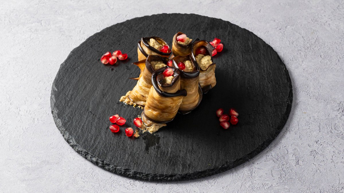 fein gewürzte Gemüsepasteten aus Spinat, Auberginen im Walnuss-Dip, Porree und Möhren