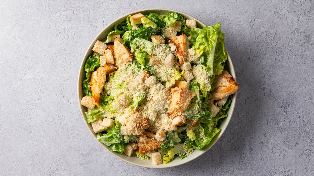 mit Römersalat, Parmesan, Croutons, Hähnchenfleisch und Dressing