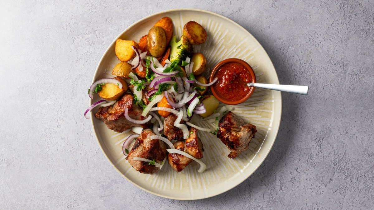 2 Stück gegrillte Schweinenacken-Spieße mit Garnitur