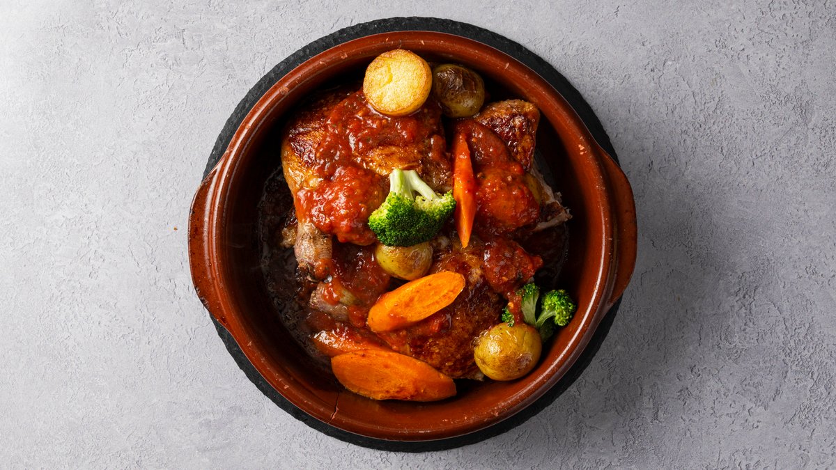zart geschmortes Putenfleisch in aromatischer Tomaten-Walnusssoße, dazu Polenta und Brot