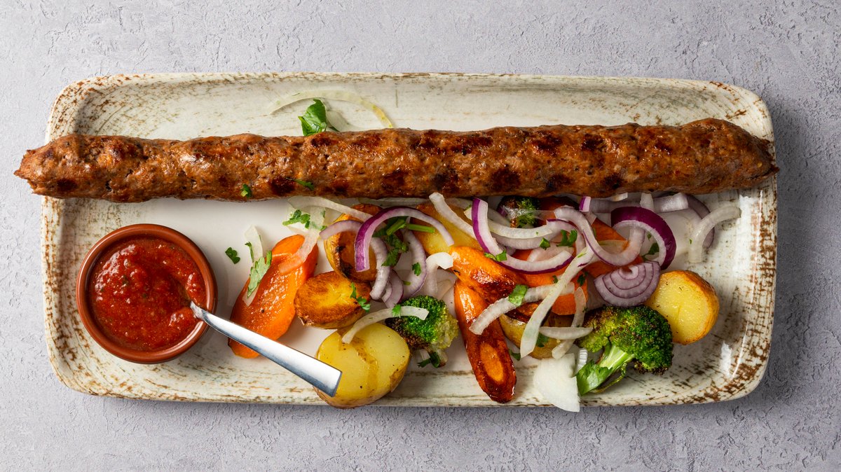 1 Stück Rinderhack-Spieß in dünnem Fladenbrot mit Garnitur